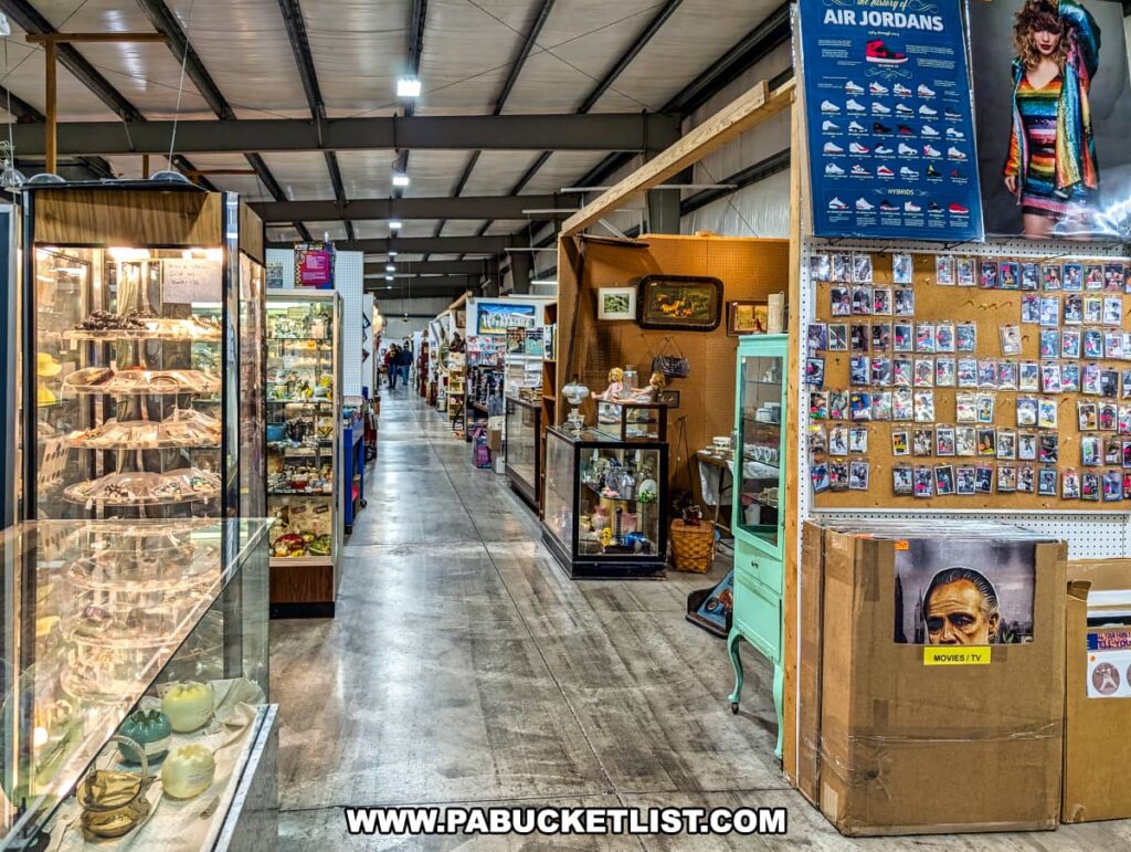 An interior view of Antique Depot in Duncansville, Blair County, PA, showcasing multiple vendor booths filled with antiques, collectibles, vintage memorabilia, glass display cases, and various nostalgic items arranged along brightly lit aisles.