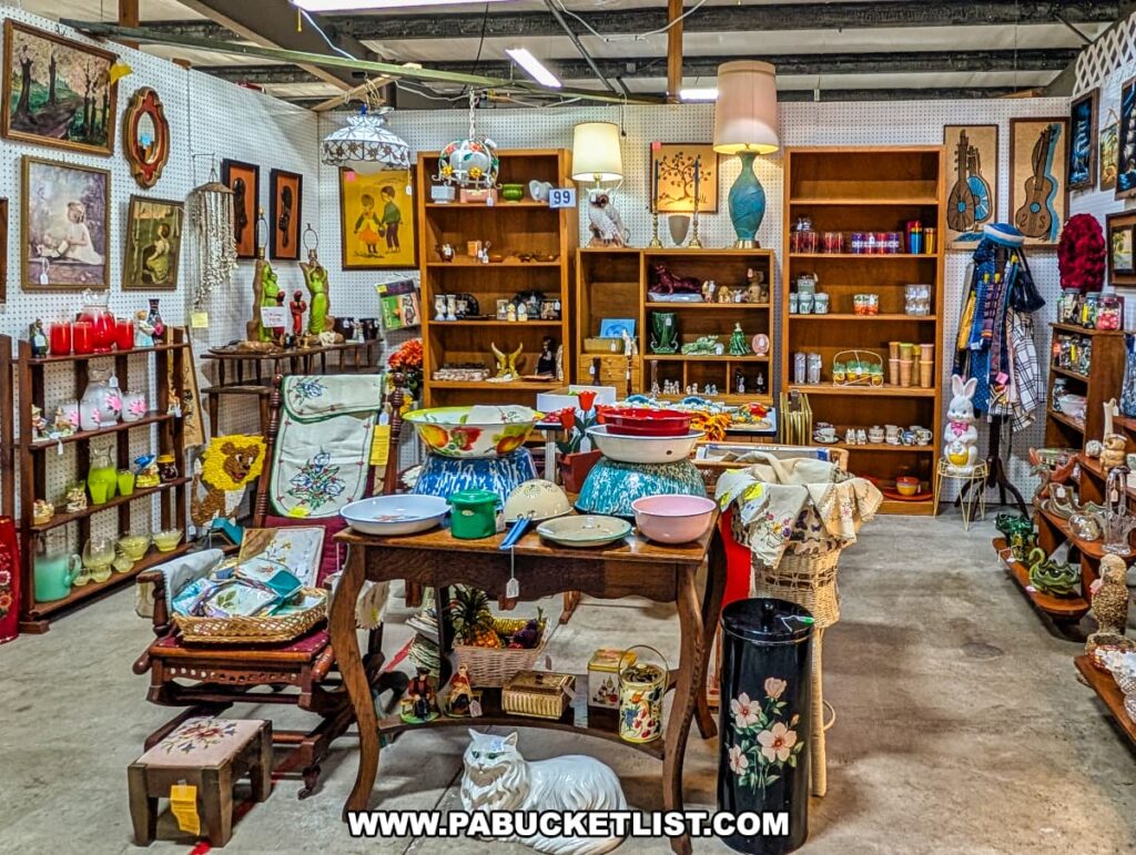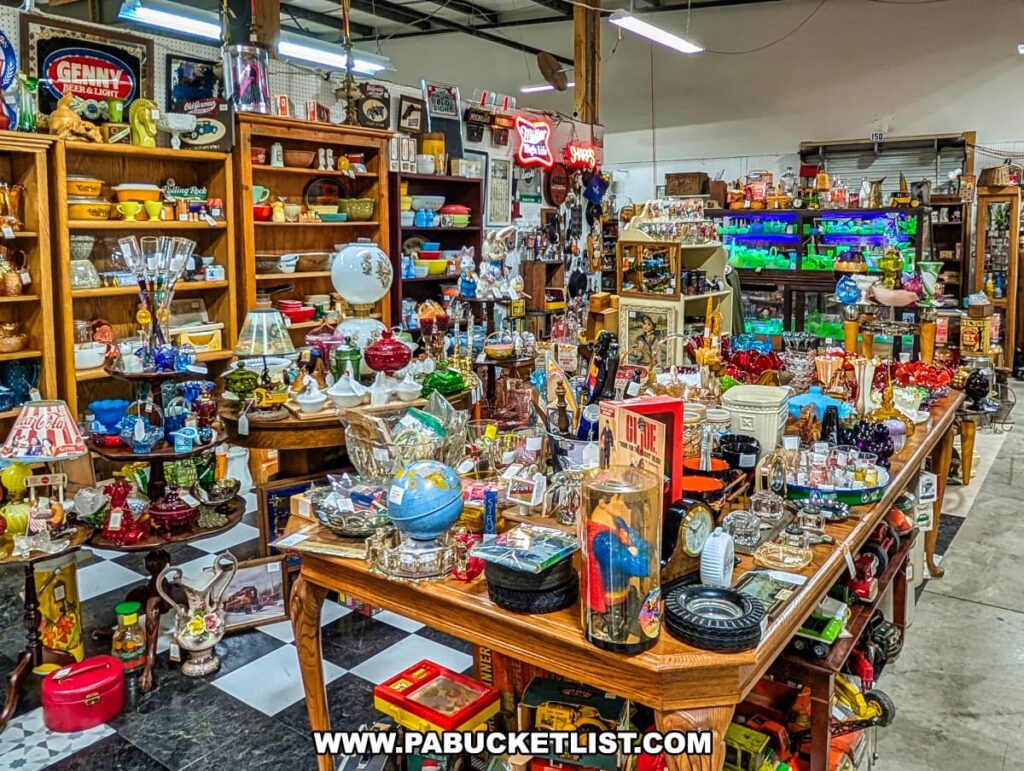 Vendor booth at Antique Depot in Duncansville, Blair County, PA, filled with an extensive collection of vintage glassware, decorative lamps, retro kitchenware, antique signs, collectibles, and unique trinkets displayed on wooden tables and shelves, creating a colorful and nostalgic shopping experience.
